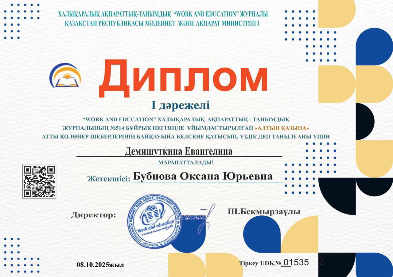 «Алтын қазына» атты қолөнер шеберлерінің байқауына белсене қатысып, үздік деп танылған үшін Хохлова Любовь пен Демишуткина Евангелина марапатталды.