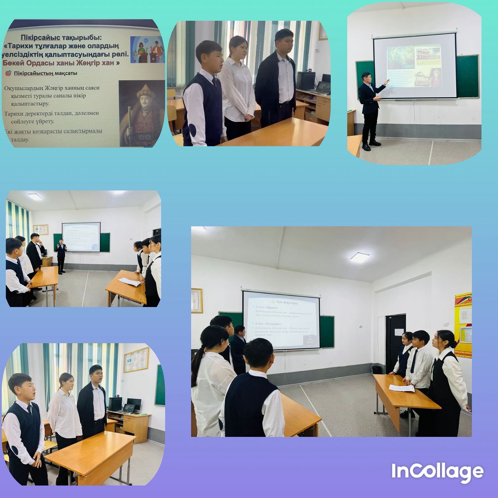 Тарих апталығы аясында «Тарихи тұлғалар және олардың тәуелсіздіктің қалыптасуындағы рөлі. Бөкей Ордасы ханы – Жәңгір хан» тақырыбында мазмұнды пікірсайыс ұйымдастырылды. Іс-шараға екі топ қатысып, өз білімдері мен тарихи деректерді талдау қабілеттерін сынға салды. Пікірсайыстың басты мақсаты – оқушылардың Жәңгір ханның саяси қызметіне қатысты саналы көзқарас қалыптастыруы, тарихи мәліметтерді саралап, дәлелді түрде ой айту дағдыларын дамыту болды. Тартысты өткен сайыс барысында қатысушылар өз пайымдарын нақты деректермен бекітіп, жоғары деңгейдегі дайындықтарын көрсетті. Жарыс қорытындысы бойынша өз дәлелдерімен ерекшеленген «Әділет» тобы жеңіс тұғырынан көрінді. Ал табандылық танытқан «Руханият» тобы жүлделі II орын иеленді. Бұл іс-шара оқушылардың тарихи танымын кеңейтіп қана қоймай, олардың еркін ойлау, пікір талдау мәдениетін дамытуға зор үлес қосты