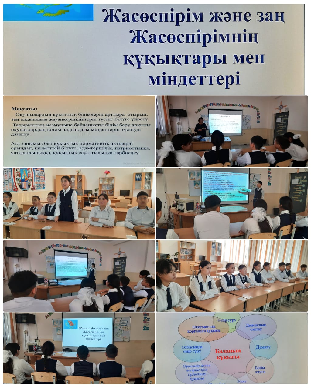 В ходе мероприятия учащимся была представлена информация о Конституции Республики Казахстан, Конвенции о правах ребёнка, а также об административной и уголовной ответственности. Были рассмотрены примеры правовых ситуаций, с которыми подростки часто сталкиваются в повседневной жизни. Полученные знания были закреплены с помощью интерактивных вопросов и ответов, а также ситуационных заданий.