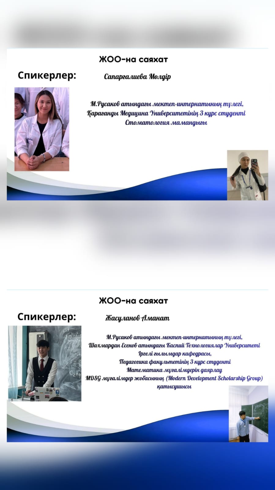 🔹 *Жасұланов Аманат* – Ш. Есенов атындағы Yessenov University, Педагогика факультеті, «Математика мұғалімдерін даярлау» бөлімінің 3-курс студенті. Сондай-ақ, ол *MDSG* (Modern Development Scholarship Group) мұғалімдер жобасының белсенді қатысушысы ретінде заманауи білім беру трендтері туралы айтып берді.