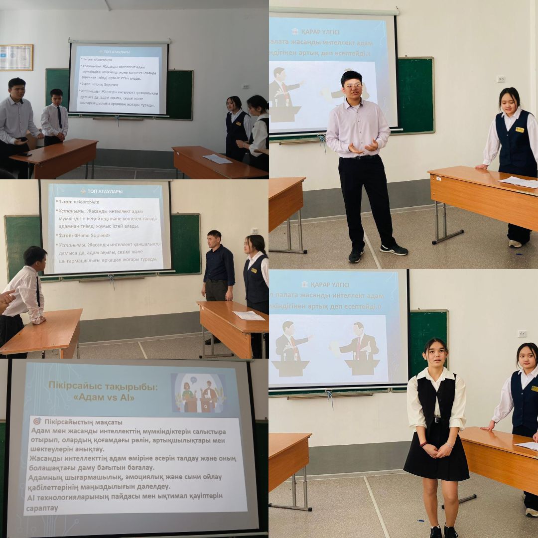 Ақпараттық және компьютерлік сауаттылығын дамыту апталығы аясында мектебімізде ерекше форматта «Адам vs AI» тақырыбында пікірсайыс ұйымдастырылды.Пікірсайысқа «NeuroNet» және «Homo Sapiens» атты екі топ қатысып, өзара тартысты ой жарыстырды. Пікірсайыстың негізгі мақсаты – адам мен жасанды интеллекттің мүмкіндіктерін салыстыра отырып, олардың қоғамдағы рөлін, артықшылықтары мен шектеулерін анықтау, сондай-ақ жасанды интеллекттің адам өміріне әсерін талдап, оның болашақтағы даму бағытын бағалау болды.Пікірсайыс қарары: «Бұл палата жасанды интеллект адам мүмкіндігінен артық деп есептейді.»Сайыс қызу пікірталасқа толы болды. Қарсы сұрақтар кезеңінде оқушылар өз білімдерін, логикалық ойлау қабілеттерін және жан-жақты ізденістерін көрсетті.